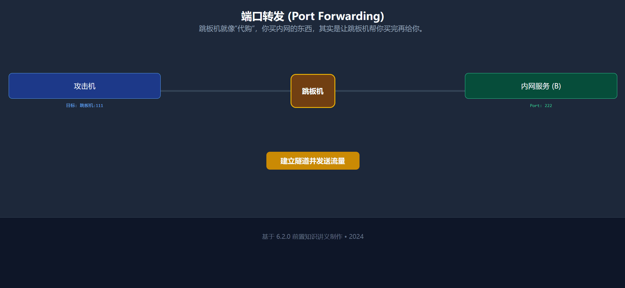 • 跳板机 A 扮演“传声筒”:你把话发给 A 的 111 端口,A 转身原封不动地传给内网 B 的 222 端口。